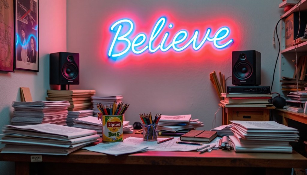 His drafting table had a pile of blueprints stacked on top of each other. At one corner a Lipton soup can with a ribbon on it that his daughter had made for him was filled with drawing pencils. At the other, tunes floated out of his Bowers & Wilkins speakers. A neon sign hung on the wall with the word โBelieveโ. The โlieโ was neon blue standing out against the โBe___veโ that were red.