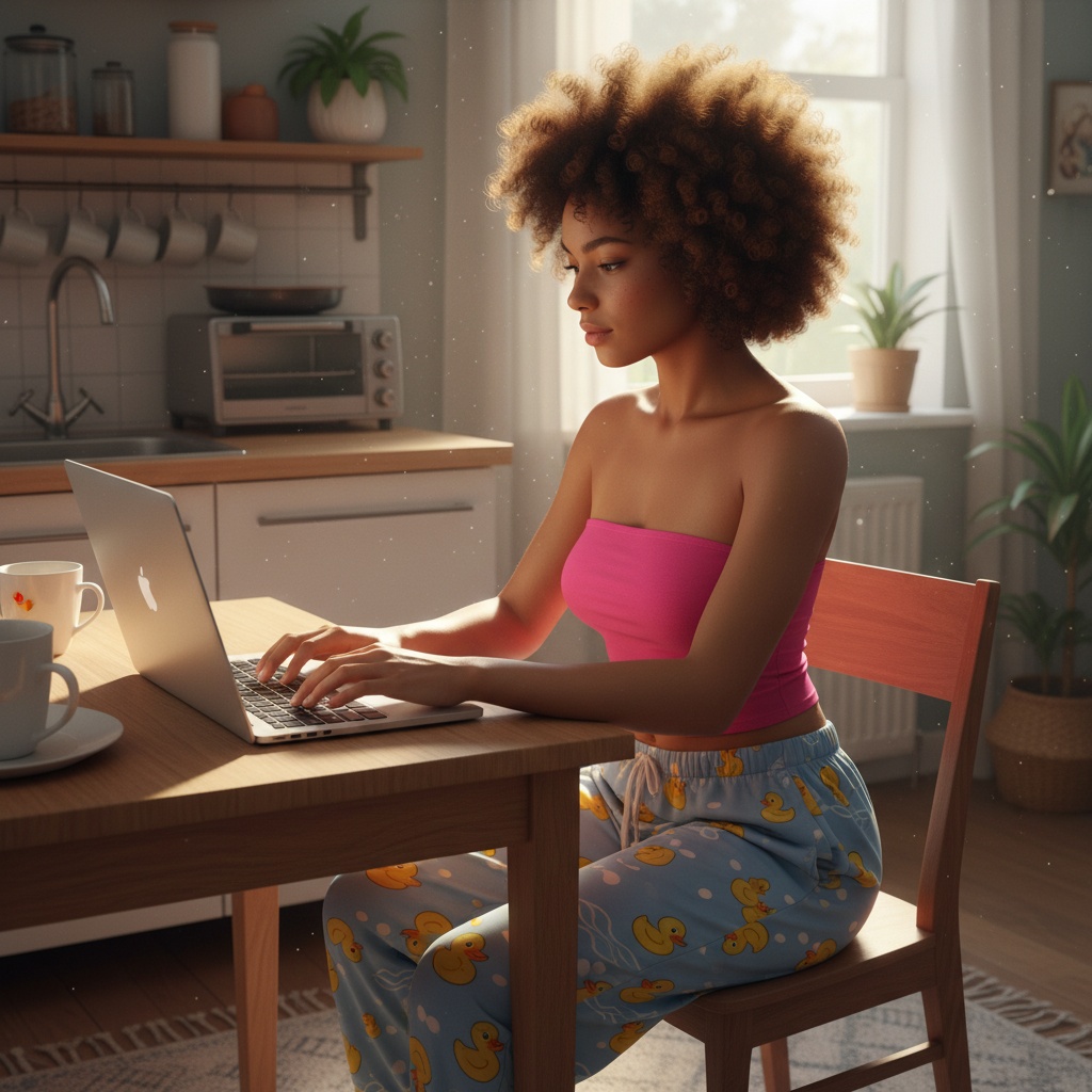 Janica smelled like patchouli and had a gorgeous afro of golden-brown curls. Her dark skin glowed and was soft and supple. Now as she sat at the table, she was wearing a hot pink tube top and pajama pants with yellow ducks on them. Tunes floated out of her speaker that was bumping one of her favorites, DJ noise.